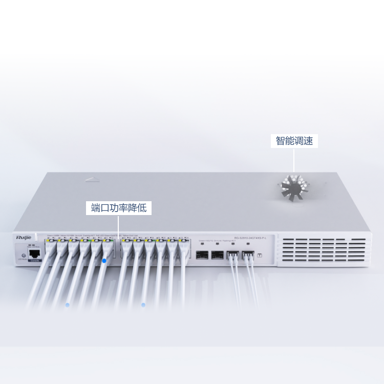 RG-S2910-L系列交换机充分响应国家绿色节能的号召,采用多种绿色节能的设计理念,针对传统交换机在噪音及能耗方面存在的问题进行深入研究探索,充分解决了交换机部署在办公环境噪声大、以及接入设备大批量部署后带来的能耗过大的问题。