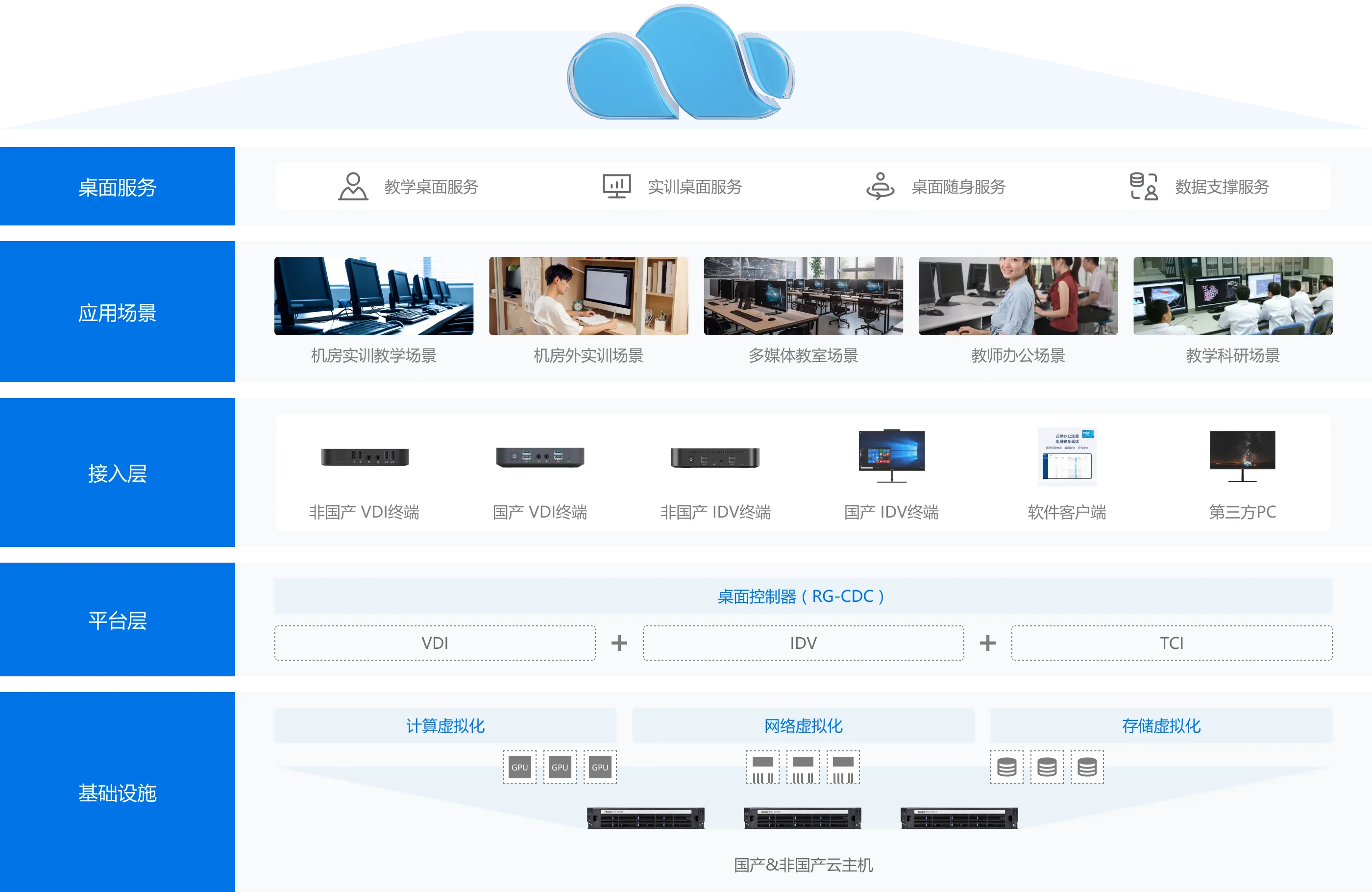 A:采用VDI架构(虚拟桌面基础架构),但学校可根据场景灵活采用TCI/IDV架构和终端,建设全场景“一朵云”。