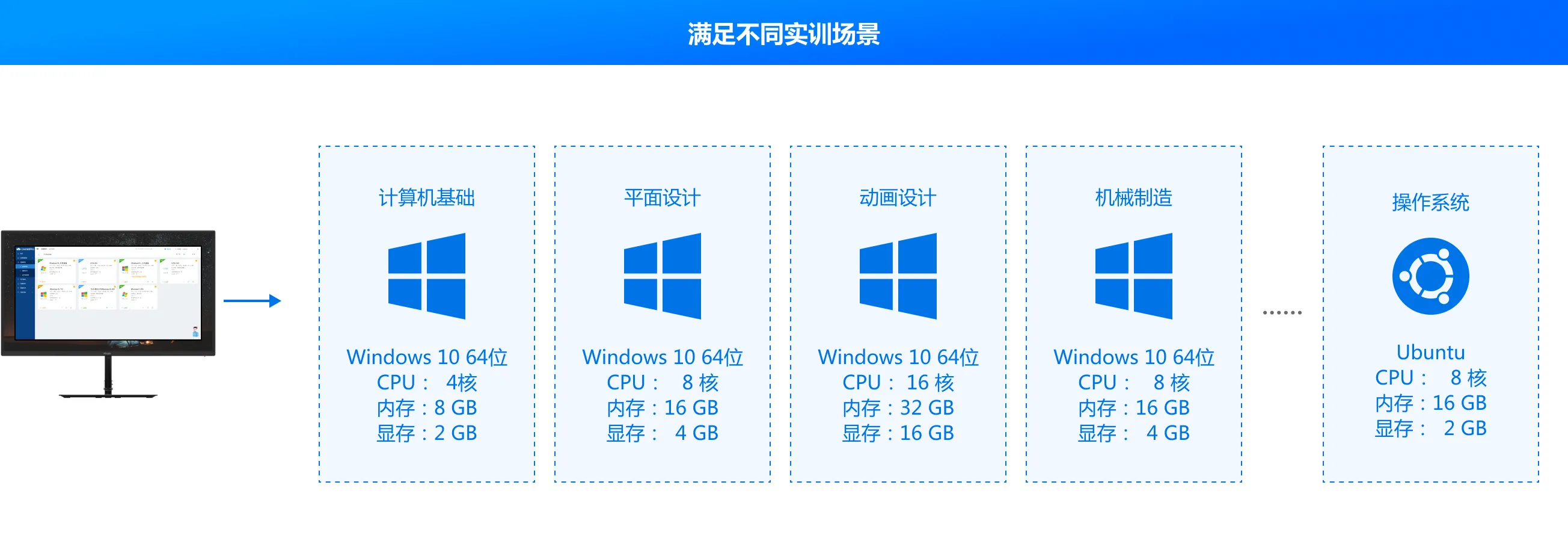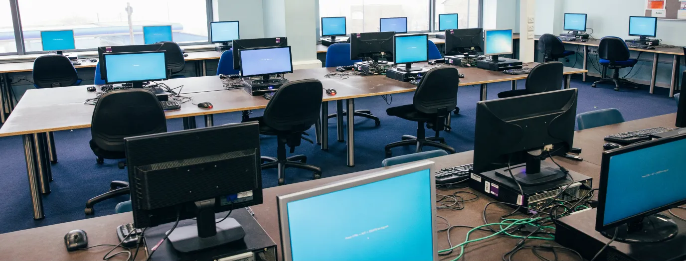 高职校中计算机机房,提供丰富的桌面教学环境,按需提供算力和软件应用