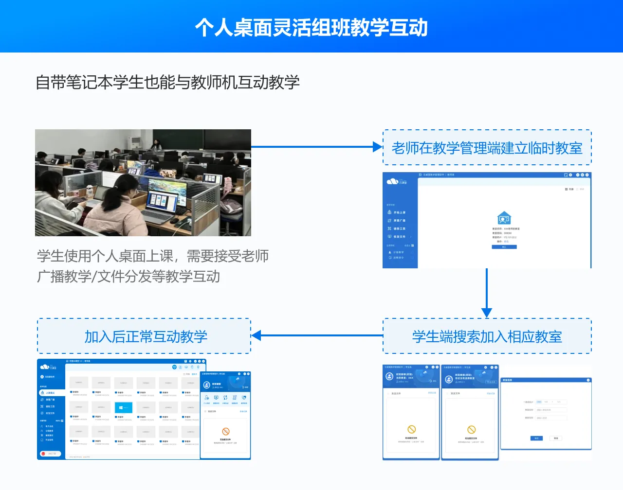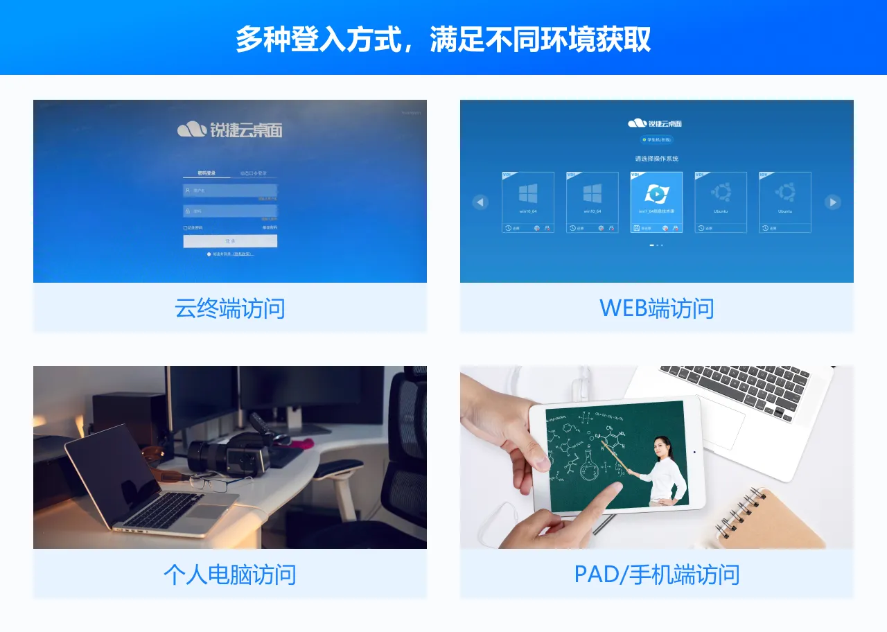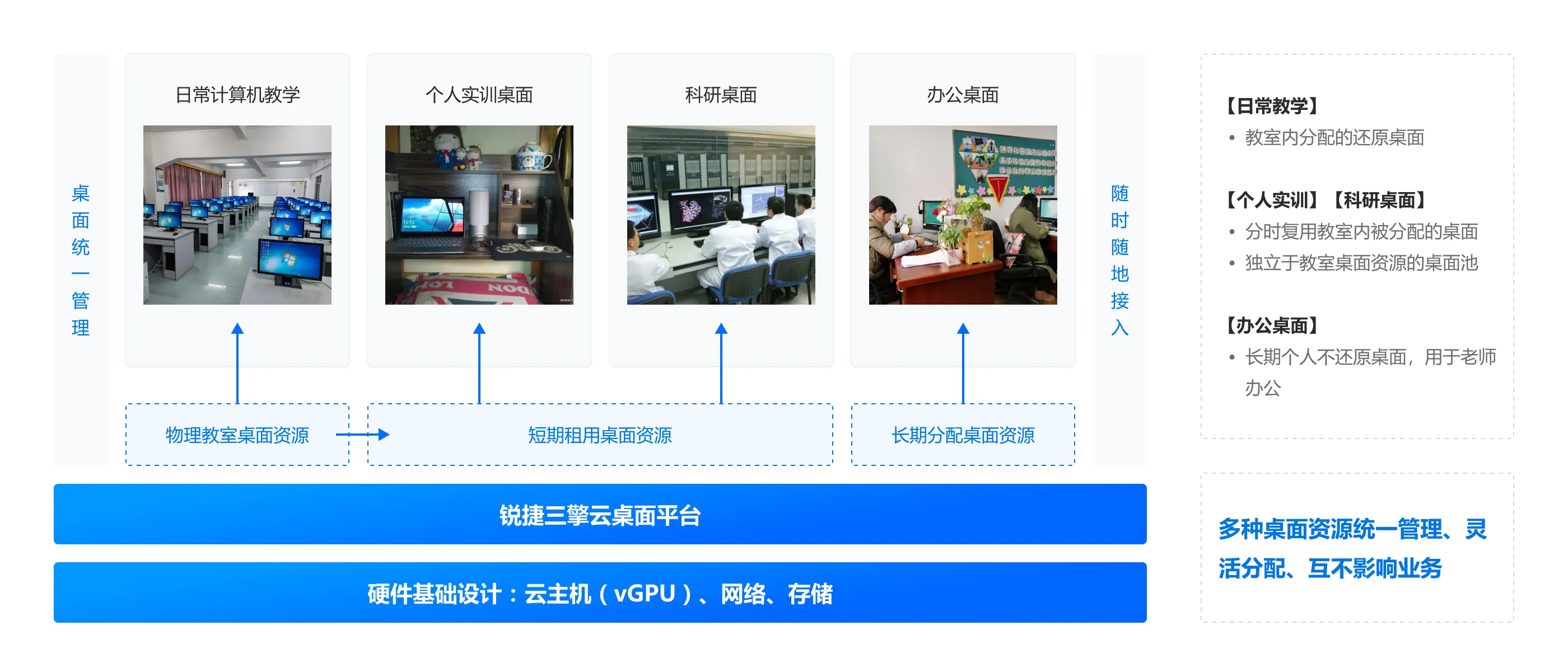 将传统机房桌面资源池化,满足日常教学、项目式实训、科研临时租用、长期办公使用场景,